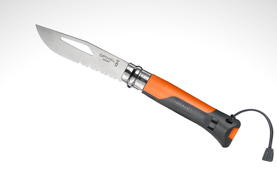 Opinel's signature lightweight wood handles are traded out for fiberglass-reinforced polyamide, which gives the Outdoor shock-, humidity-, and extreme temperature resistance. Its outdoor functionality is rounded out with a 110db survival whistle, an integral lanyard for ease of carry, and safety lock to keep it closed during travel and transport.